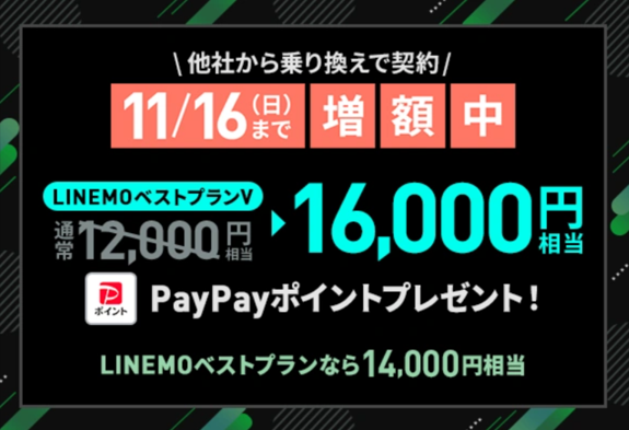 対象申し込み期間中に他社からLINEMOへ乗り換え(MNP)で契約をして、さらに対象となるキャンペーンの適用条件を満たすと、4,000円相当のPayPayポイントを追加でプレゼント!