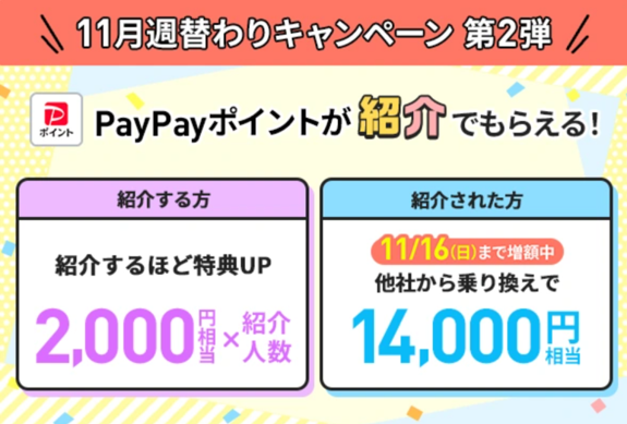 紹介された方は、他社から乗り換えなら最大14,000円相当、新しい番号で契約なら最大7,000円相当のPayPayポイントをプレゼント!